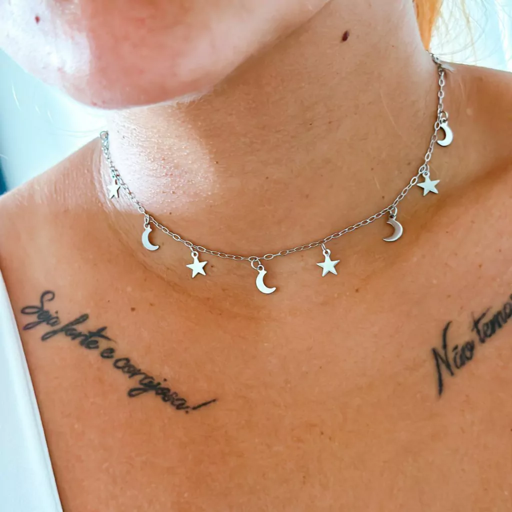 Choker E Gargantilha Luas E Estrelas Nova Aço Inox Prata